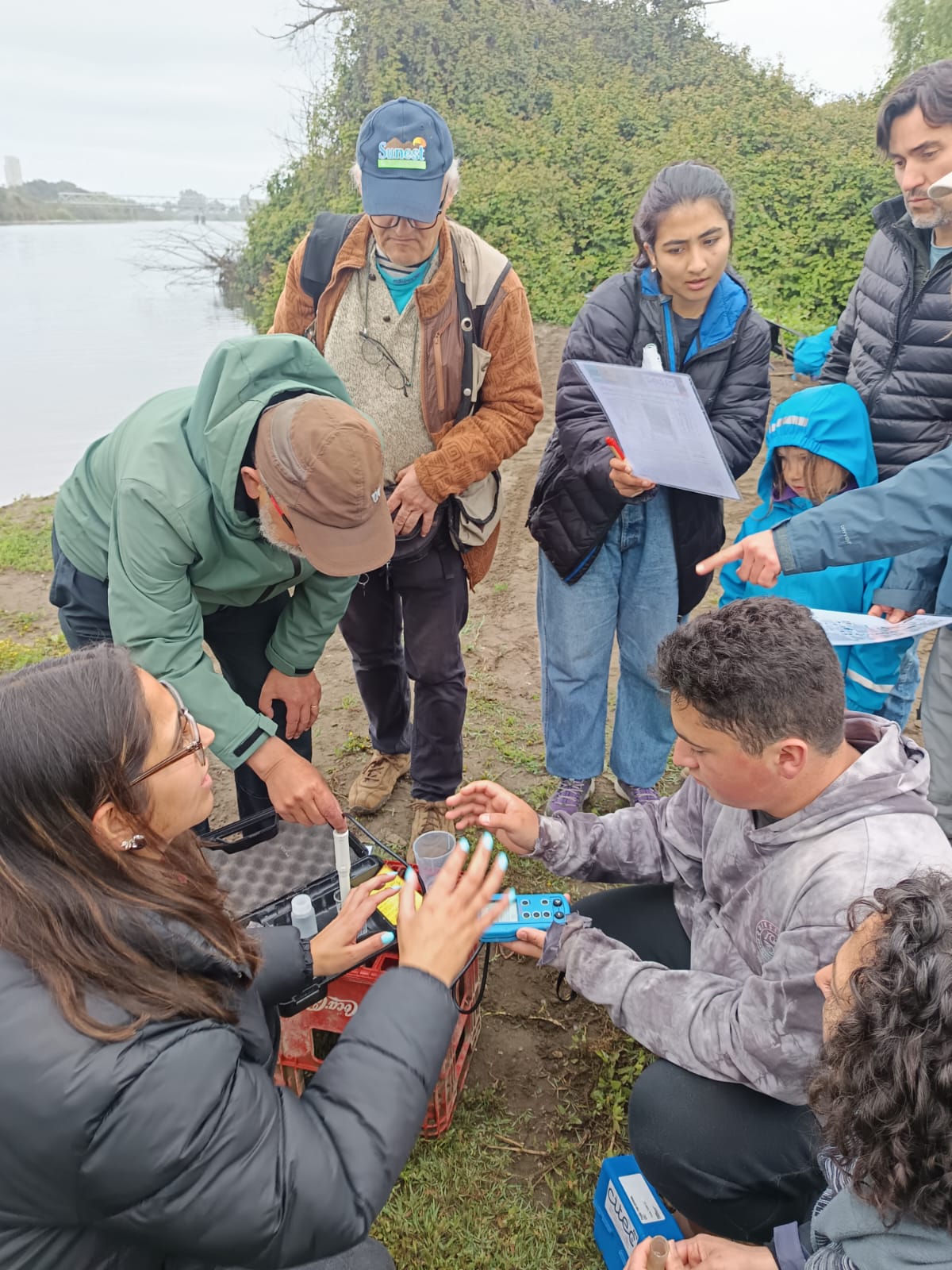 En noviembre y diciembre de 2025, 6 equipos fueron a hacer sus mediciones mensuales en 1) Concón, 2) Quillota, 3) Catemu, 4) Putaendo, 5) Los Andes, 6) río Colorado, usando los 3 kits de monitoreo con los que cuenta el proyecto. El kit está en una mochila y contiene un multiparámetro con una sonda que mide temperatura, pH, conductividad eléctrica y sólidos disueltos en el agua. También viene con 2 kits de titulación (con colorimetría) que miden dureza y alcalinidad total y un tubo de tiras de papel que miden nitrito, nitrato, dureza, pH y alcalinidad. Hay una cantidad limitada de test de detección de coliformes totales y e-coli. Cada grupo cuenta con un librito para ir anotando los valores de las mediciones de los diferentes parámetros, además, en él incluyen información relevante como quién está midiendo, la fecha, hora y las observaciones del estado del río, el entorno y del clima. Algo importante además de hacer las mediciones es sacar una foto repetitiva del río, para tener como testimonio de su estado y del entorno, incluido el clima este día. Así siempre sacan del mismo lugar, para poder comparar el color del agua, la vegetación, si hay nieve en las cimas en el fondo y el estado del cielo.